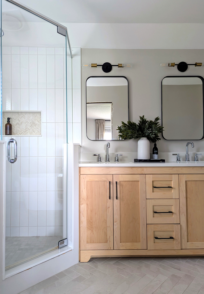 This project brief required a complete renovation including a stand alone tub, new shower with rainfall shower head and new double vanity, all done in a spa-like neutral farmhouse design style.